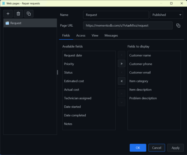 - Fields to display (right column): Shows the fields that will actually appear on the form