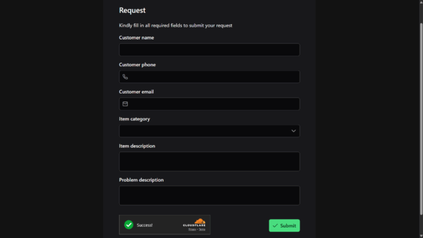 Customer Service Request Form: Display only customer contact fields (name, phone, email) and problem description. Internal fields like priority, status, and technician assignment remain hidden for staff to complete later.