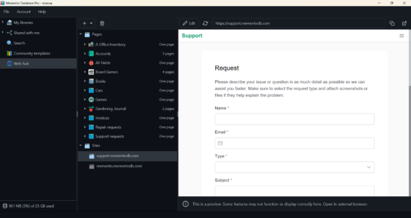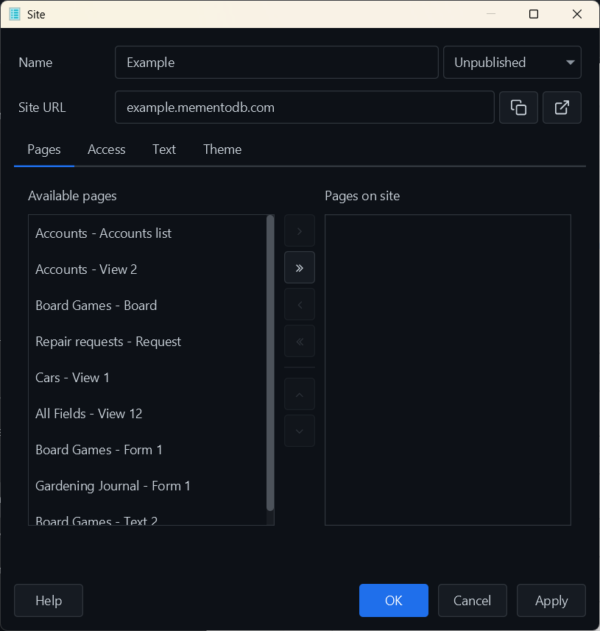 The Websites feature in Memento Database allows you to aggregate various Web Pages and Web Forms into a single, unified portal. This transforms separate links into a professional web interface with integrated navigation and a consistent style, all hosted on your own subdomain.