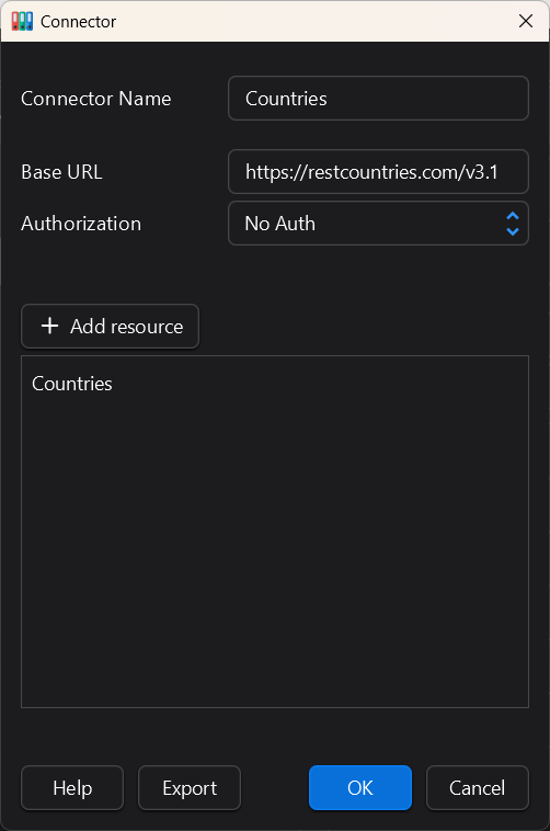 • Connector Name: A recognizable name for your integration (e.g., “Countries API”).